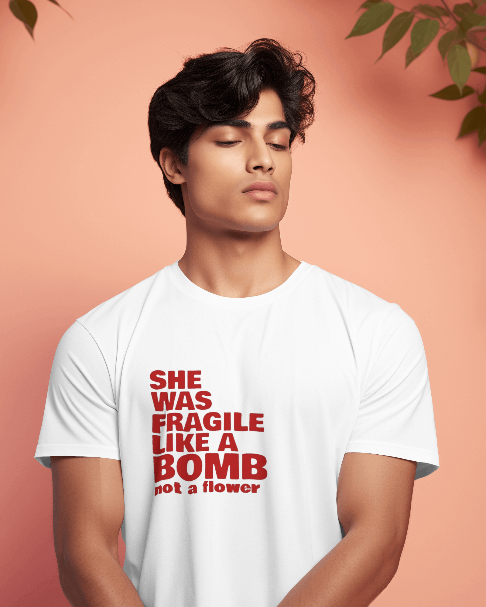 This t-shirt features a strong, eye-catching quote: “She was fragile like a bomb, not a flower.” It’s the perfect way to show confidence and inner strength.